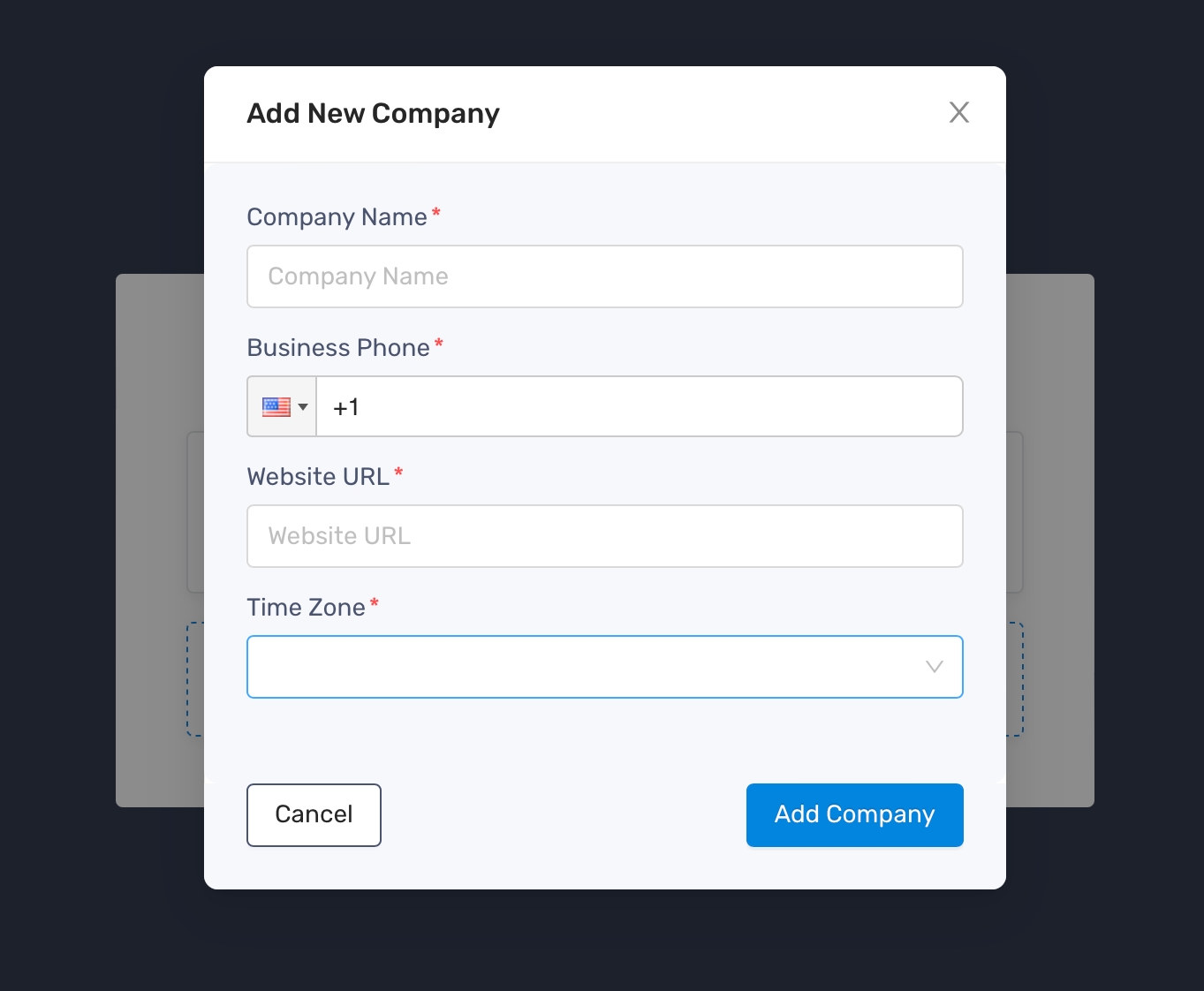 - Enter Company Name, Business Phone, Website URL and select the Time Zone of your choice